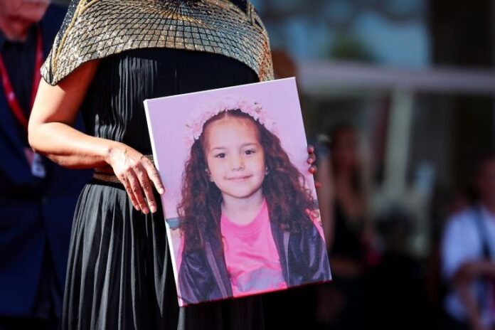 Tunisian director Kaouther Ben Hania holds a picture of Hind Rajab on the red carpet during arrivals for the screening of The Voice of Hind Rajab at the Venice Film Festival, on September 3, 2025 [Yara Nardi/Reuters]