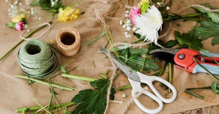 For creating floral arrangements, you need basic supplies like floral foam, scissors, pruning shears, pliers, packaging such as paper and ribbons, and florists’ wire and tape.