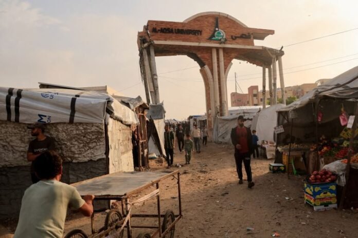 People walk through the damaged gate of Al-Aqsa University in Khan Younis, Gaza Strip, November 24, 2025 [Haseeb Alwazeer/Reuters]