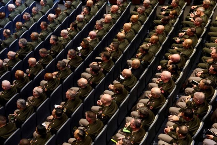 Washington, DC – United States President Donald Trump has addressed hundreds of US generals in Virginia on topics ranging from climbing up stairs to the crisis in Ukraine – often repeating his talking points and bouncing between subjects.