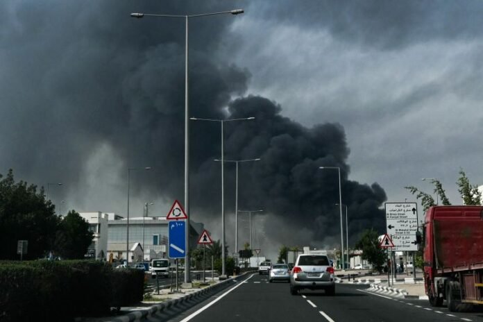 Motorists drive past a plume of smoke rising from a reported Iranian strike in the industrial district of Doha [Mahmud Hamas/AFP]