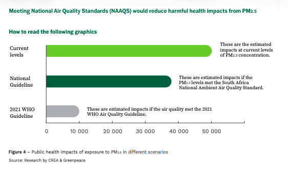 Air pollution health costs total approximately $52bn (R832bn) per year, according to a report by Greenpeace Africa & Centre for Research on Energy and Clean Air. The majority of this cost is due to the loss of life, followed by preterm births. The $52bn is enough to fund the country’s health budget for more than two years.